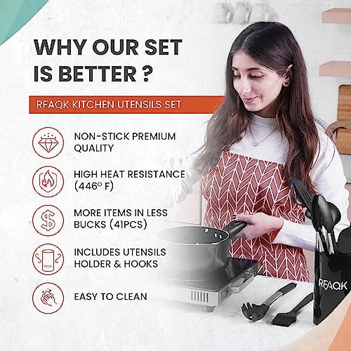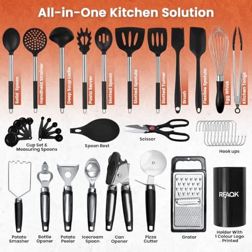 ✅33-Piece Silicone Kitchen Utensils Set + 8 Kitchen Gadgets 🍳: Upgrade your cooking game with our ultimate kitchen essentials kit, complete with 33 high-quality silicone utensils and 8 modern kitchen gadgets. From flipping pancakes 🥞to slicing pizza🍕, this set has got you covered for all your culinary adventures!