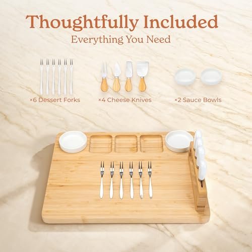 Smirly’s Charcuterie Set makes entertaining effortless and elegant with a spacious bamboo board, built-in magnetic knife holder, ceramic bowls, and stylish forks. It includes a matching fruit tray, design guide, and gift-ready box—combining sustainable craftsmanship with all the tools you need to create show-stopping spreads.