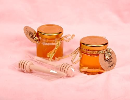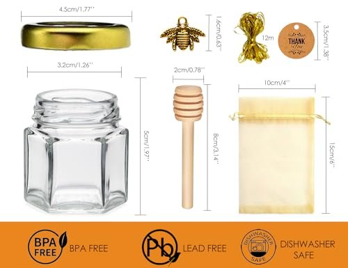 What You Will Get: Our 1.5oz mini glass honey pot is come with Bee-Themed Accessories, including 20 pcs glass honey jars and wood dippers, 20 pcs gold lids, 12m gold fabric ribbons, 20 pcs bee charms, 20 pcs gold gift bags and 20 pcs thank-you tags